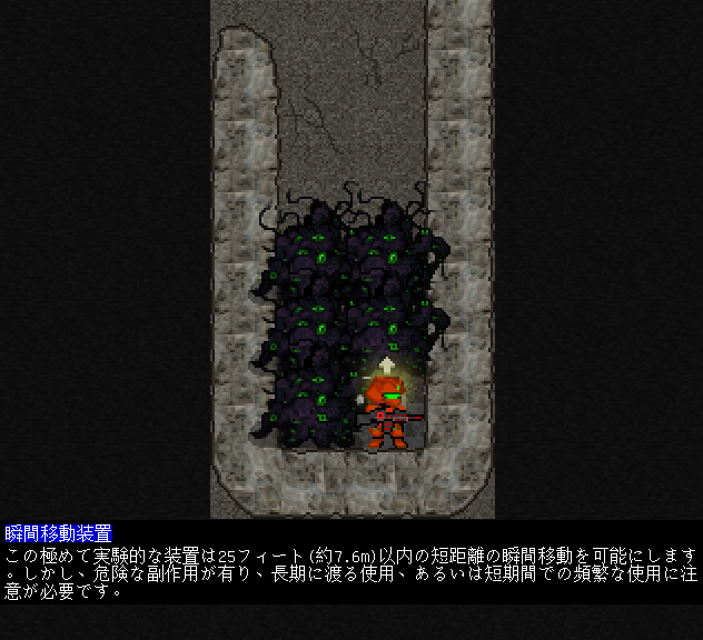 怪しげなNPCの事情なんてどうでもよろしい。現在の俺は5体のショゴスに包囲されており大ピンチなんだよ。地下4階は火炎が吹き荒れているので上の階へ逃げるのは無理です。魔力結晶は効果が発揮されるまで1ターンかかるので手遅れだ。この状態から脱出するにはCBM:瞬間移動装置を稼働させるしかない。瞬間移動装置はランダムな位置にテレポートするから怖いんだけどね。しかも稼働したあとに副作用で体調が悪化する。