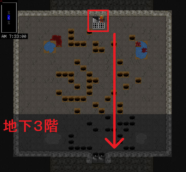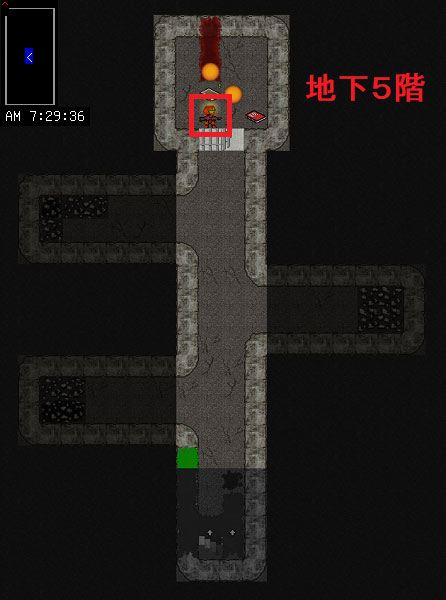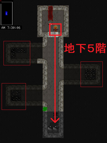 現在地の地下5階は上の画像の様になっています。もうモンスターは全滅したのでサッサと上階に戻りたいところだ。だがしかし、地下5階には怪しいアイテムが置いてあるので調べておきたい。