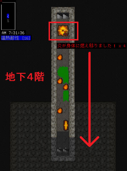サッサと階段を上って地下4階に戻りました。地下4階は床からランダムに火炎が吹き出す恐ろしい階層だ。南の階段へ行くまでに何度も火炎に焼かれてしまったが軽傷で済みました。耐熱の秘術はもの凄い優秀なんだよ。燃え盛る民家に突っ込んでも無事でいられるんじゃないの。