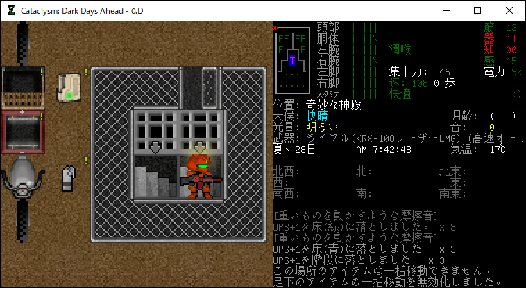アイテムの一括移動でUPSを引きずりながら進みましょう。俺の環境だと『\』コマンドで一括移動を有効化できます。たぶん0.Fだと別のコマンドに変わっていると思う。大量の物資が置かれている拠点で一括移動をすると大惨事になるから注意してください。