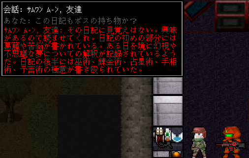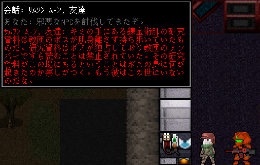 サムワン・ムーンに邪悪なNPCの討伐を報告しました。意外にも事態を把握して納得したようです。地下5階から持ち帰った錬金術師の研究資料は教団のボスが独占していた。誰にも読ませずに厳しく管理していたのだ。その研究資料を俺が持っているので彼の身に何が起きたか察しがついたんだってさ。きっと殺されでもしなければ手放さないほど大切にしていたのだろう。研究資料の内容を読めば邪悪なNPCが実在したことも納得できると思うよ。