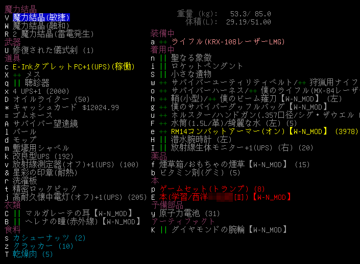 現在の所持品と装備品です