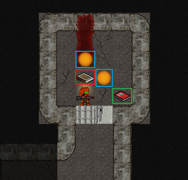 俺のいる牢獄の中には手つかずのアイテムが沢山あるのだ。赤い四角で囲んだ場所は前回の投稿で漁ったNPCの遺品です。青い四角で囲んだタイルはアーティファクトだな。緑の四角で囲んだ場所には本が置かれている。