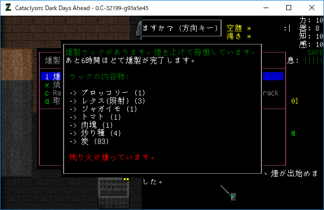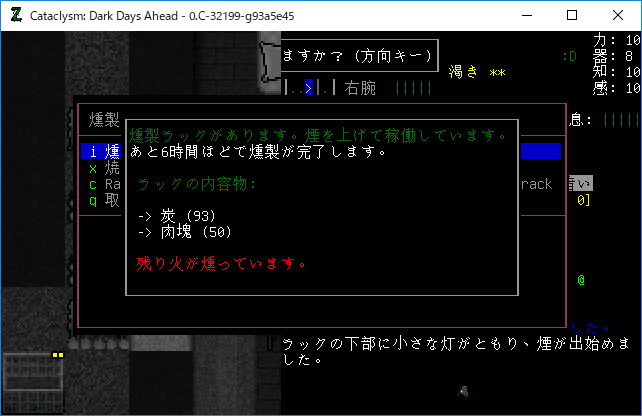 炭を装填したラックに火をつけることができたぞ『e』。やっと燻製ラックの性能を知ることができます。マッタリと冷蔵庫を整理しながらプレイ日記を終えようぜ(眠かった)。