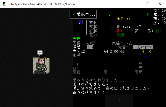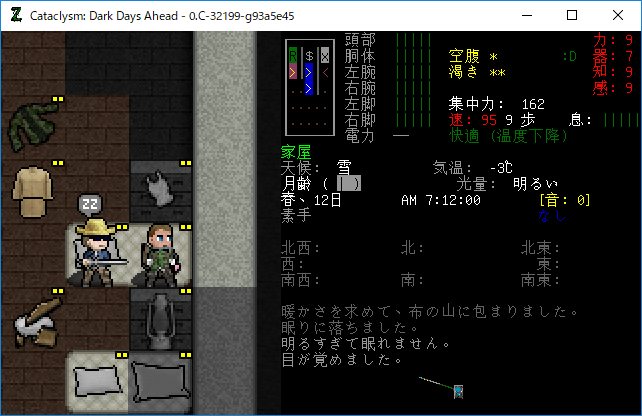 Cataclysmのプレイ日記を始めます。前回は町中の食料を集めて疲れた。今回は読書でもして適当にスキルを上げよう。リアルに疲労をしていたから街を歩き回る気力は無い。