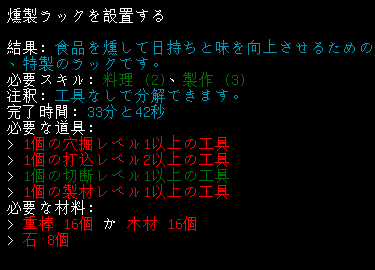 内臓解体、部位解体、精密解体はよく分かりません。まあ動物から肉を得るには完全解体がベストだろう。完全解体を実行して大量の肉塊+etcをゲットする。収穫量を見て頭にピコーンとスイッチが入ってしまったね。この肉を燻製すれば食料に困ることはなくなる!