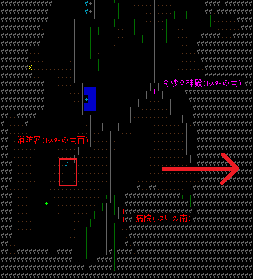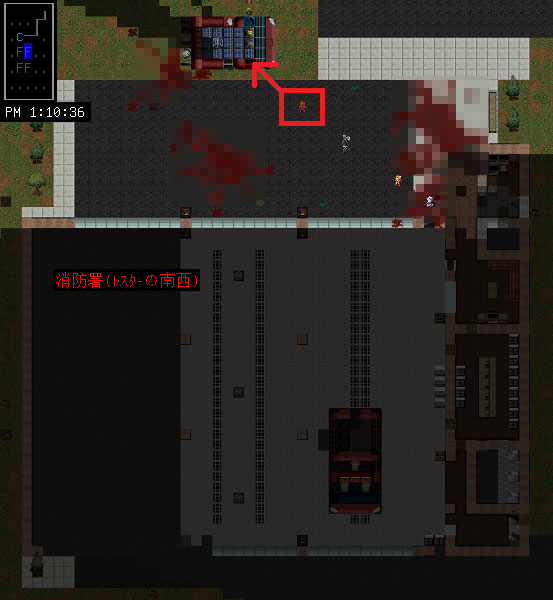 現在地はレスターの南西にある消防署だ。赤い矢印の方向に進んで奇妙な神殿の東側に向かいます。少し南へ行くと『病院』があるけど、南の道路を走行するのは後日に行います。