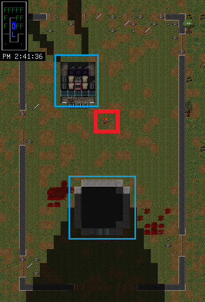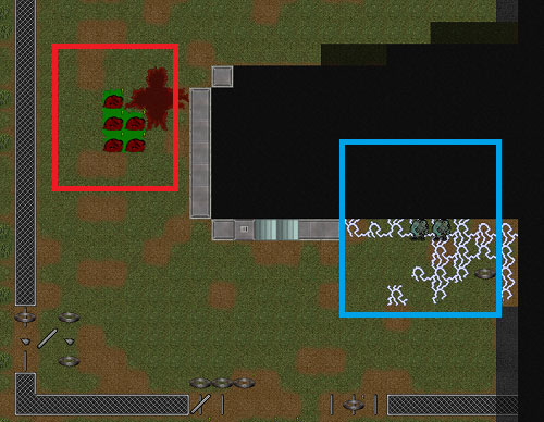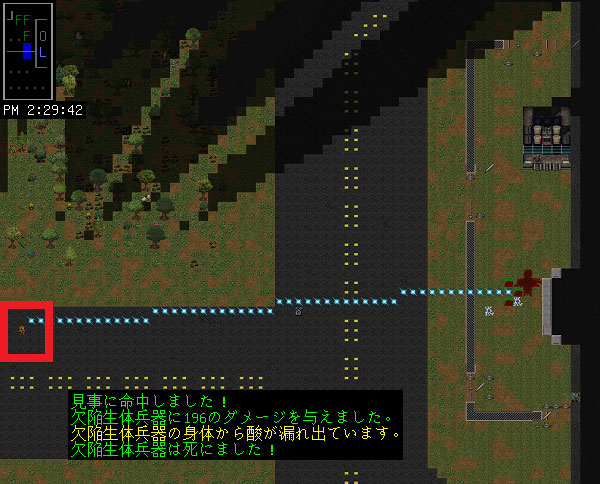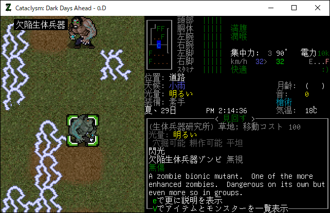 生体兵器研究所は『Cataclysm++MOD』の施設かもしれない。非常に気になるので東にある生体兵器研究所を偵察することにしました。生体兵器研究所の左端を視界に捉えた時の俺は上の画像。何者かがバチバチと電撃をまき散らして戦っている!