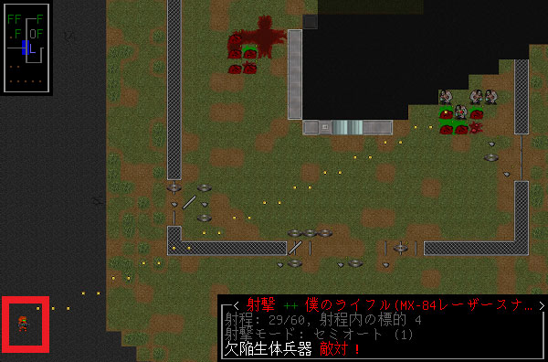生体兵器研究所にはカードリーダーで施錠された建物があります。その周囲をグルグルと欠陥生体兵器が徘徊していたようだ。建物の西側にいた敵は先ほどの狙撃で全滅させた。次は建物の右側にいる敵を攻撃します(青い四角の場所)。
