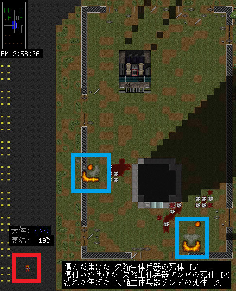 地上の敵は無力化したけど、まだやらなければいけないことがある。今のままだと傷ついた欠陥生体兵器ゾンビの亡骸が復活しちゃうんだよ。欠陥生体兵器ゾンビの亡骸は『s』コマンドでぶっ叩いてもドロドロにはできない。いっそ燃やしてしまうのもアリだが天候は小雨だ。簡易解体でバラバラにする方法もあるけど亡骸の数が多いから大変です。