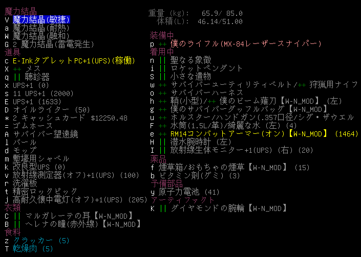 今回の投稿はここで終わりにします。現在の所持品と装備品は上の画像。UPS電力はタップリ残っているので秘匿研究所と同じくらい敵が現れても討伐できる。本当に秘匿研究所と同じような施設だったら科学研究所を探す意味が無くなるかもな。