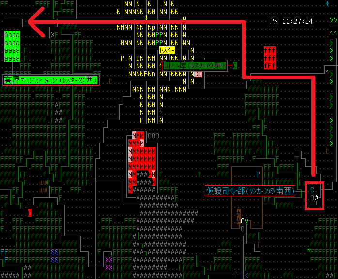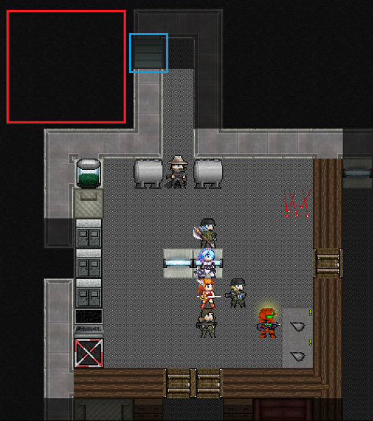 もう仮設司令部に用事はありません。地上に戻っても良いのだが、個人的に確認したいことがあるのだ。ルーターのオッサンが立っているタイルの奥には金属製のドアが設置されています(青い四角の位置)。俺は以前からあのドアが気になっていたんだよ。赤い四角で囲んだ場所に隠し部屋があるんじゃないの?