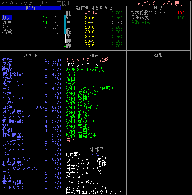 現在の能力値は上の画像。CBMを移植しまくったおかげでタロウ・タナカは強くなった。腐った食料さえ消化できるようになった。だけど、もう精密解体をする機会は無いだろうなあ。次回はレスター南の病院を攻略します。