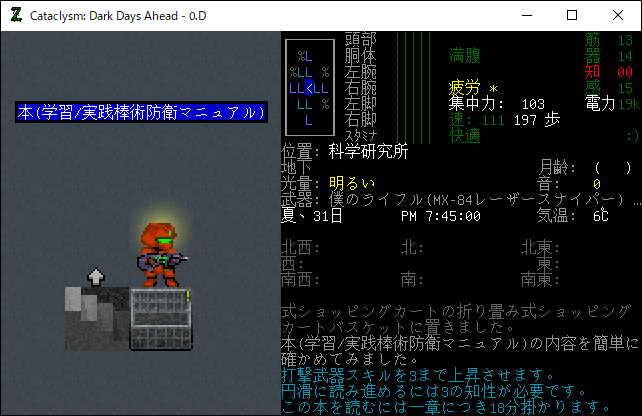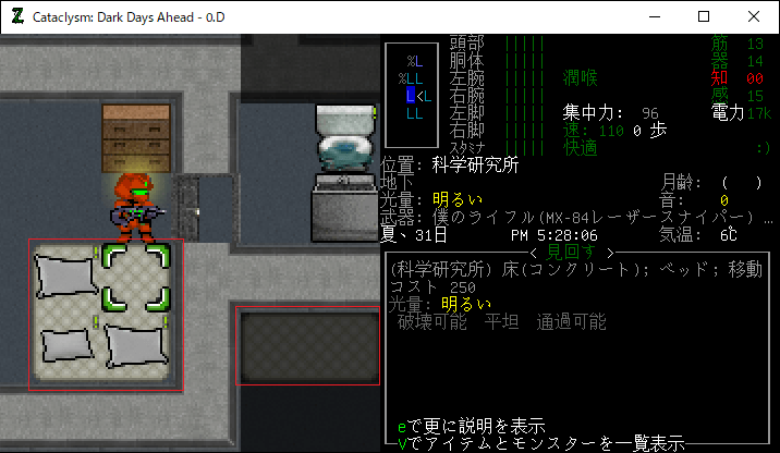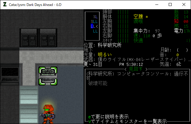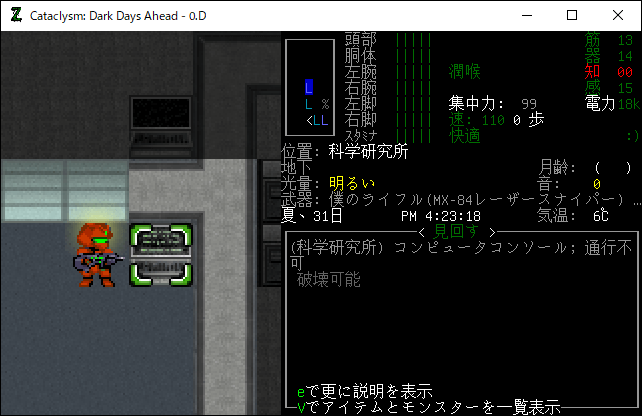 Cataclysmのプレイ日記を始めます。科学研究所の地下1階を歩き回りました。広い施設なので攻略するのに時間が掛かりそうだ。今回は地下1階の制圧を目指します。