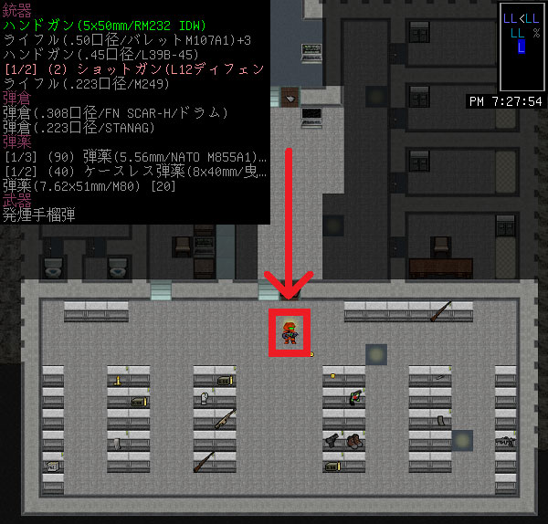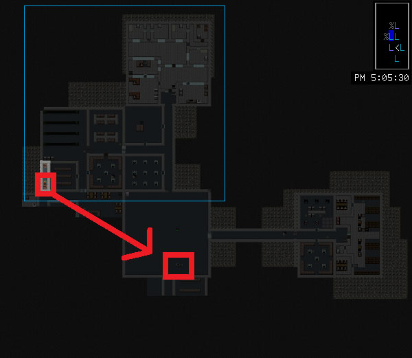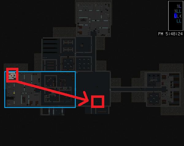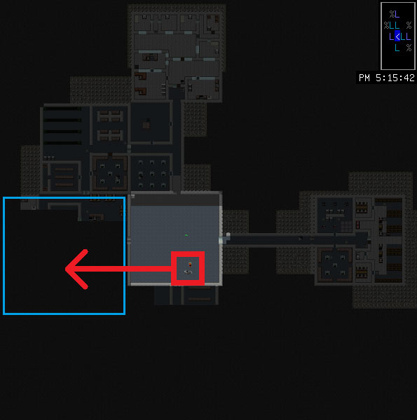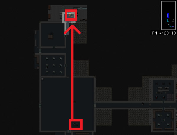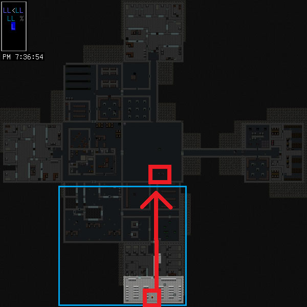 現在地を縮小すると上の画像になる。スタート地点の階段からだいぶ北側へ歩いたのに何の収穫も無かった。敵も出てこなかったんだよね。施錠されたドアの向こう側へ行けば戦利品をたんまりと回収できるのだろうか。