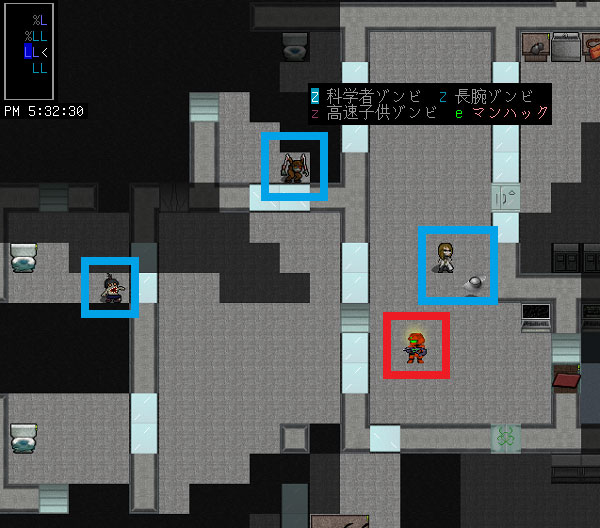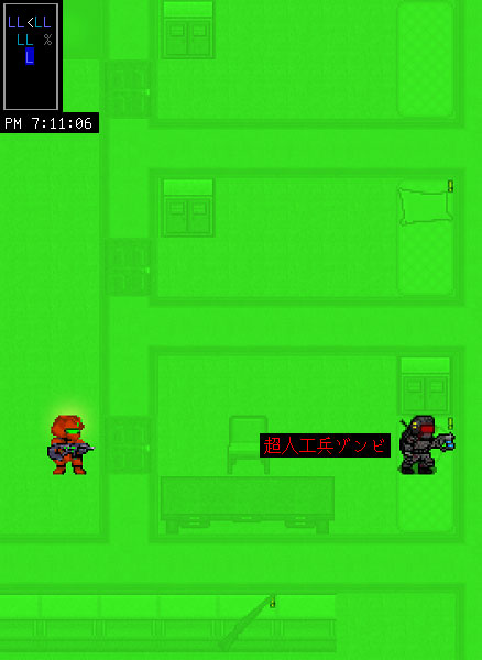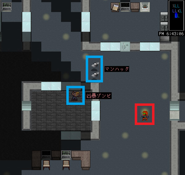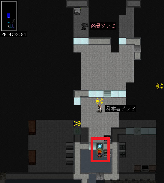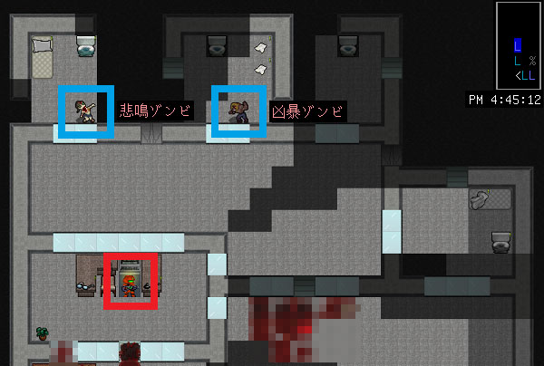 このままでは何の収穫も無いまま地下1階北側の探索が終わる。お宝に期待してドアをぶっ壊します。ドアの向こう側には凶暴ゾンビと科学者ゾンビが徘徊していやがった。