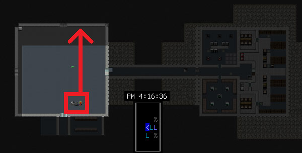 ひたすら北へ移動したら施錠されたドアに辿り着いた。コンピューターをハッキングすれば開けられるドアだ。前回の投稿で見つけた図書館のドアと同じです。