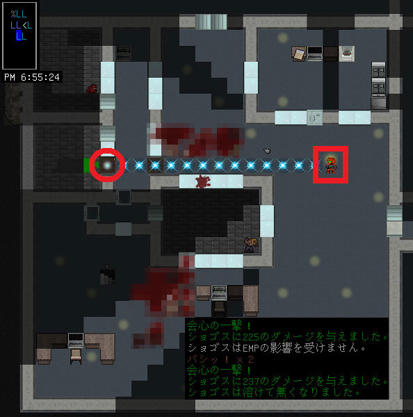 ショゴスが収監されている牢獄を見つけてしまった。このまま放置していたら強化ガラスをぶっ壊して脱出するんじゃないの?ぶっ倒しておきたいが、現在の位置だと反撃をくらってしまう。