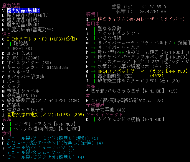 今回の投稿はここで終わりにします。現在の所持品と装備品は上の画像。UPS電力の残量が少なすぎる。補給のために地上へ戻ると地下2階を攻略する時間が無くなる。今日中に地下2階を制圧するのは諦めて精密解体ガチャでもやろうか。