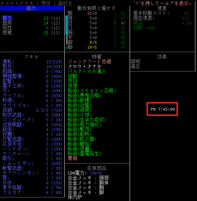 現在の能力値は上の画像。たしかCBM電力をUPS電力に変換する方法があったと思う。俺の記憶違いかもしれないけどさ。次回はたぶん科学研究所の地下2階を攻略します。