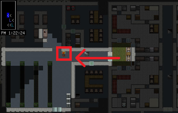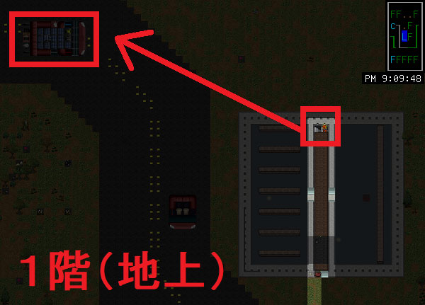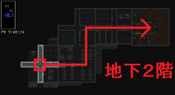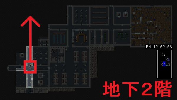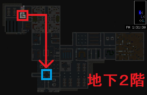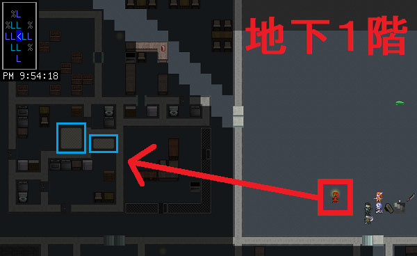 物資を運びながら仲間と一緒に地下1階へ戻りました。就寝する際に使う部屋は階段の西側にあります。青い四角で囲んだ場所ですな。
