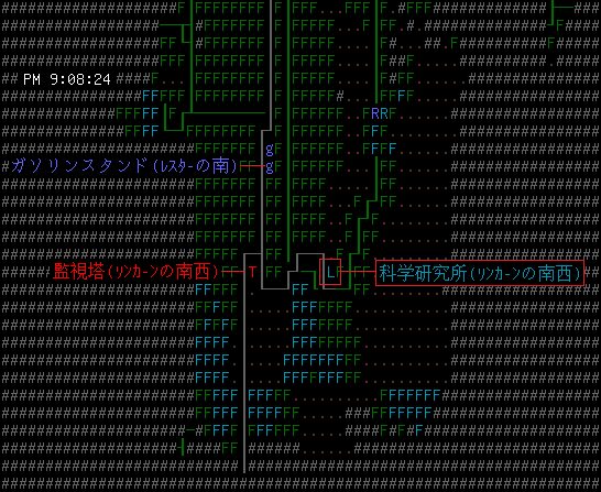 現在地はリンカーンの南西にある科学研究所の地下2階だ。時刻は夜なので科学研究所の探索を一時中断しよう。地上に戻って補給したり、なんらかの作業をします。