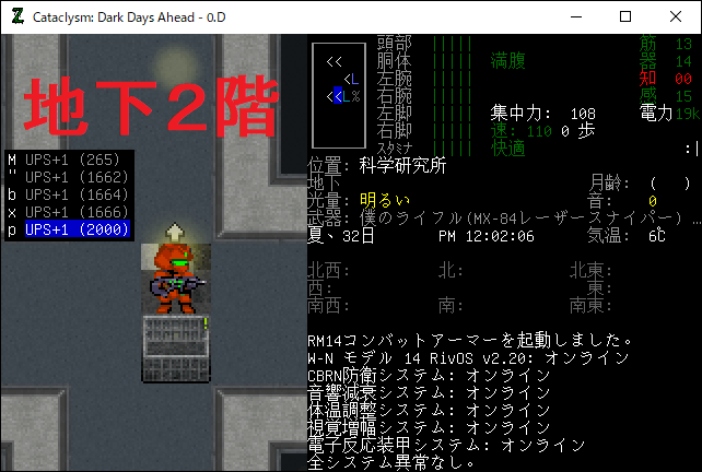 科学研究所の地下2階に戻りました。これより地下2階の探索を再会します。UPS電力の残量が微妙だけど、CBM電力を活用すれば余裕でしょう。