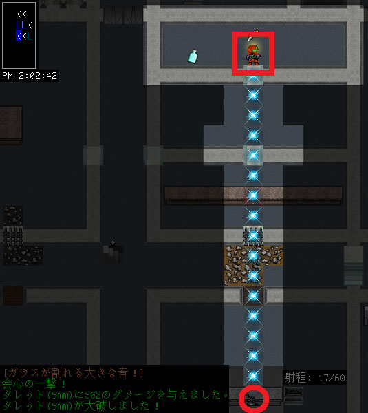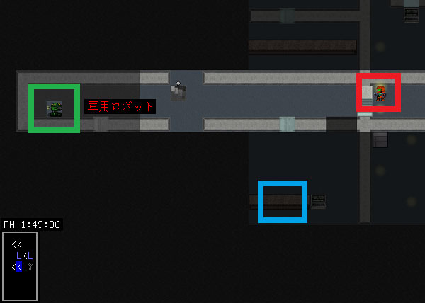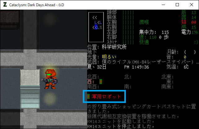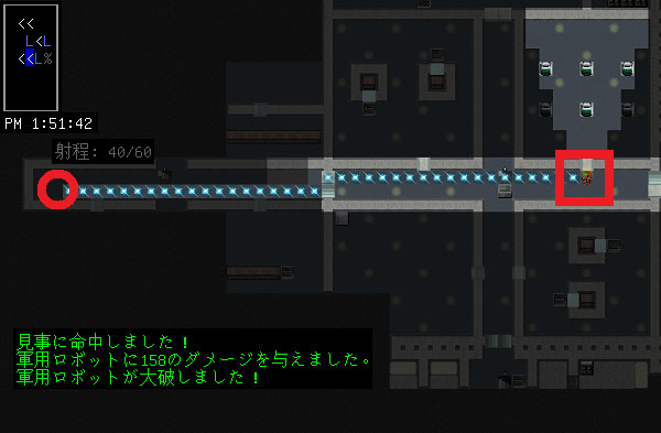 銃器で武装している敵を手っ取り早く倒すには相手の射程外から攻撃するしかない。軍用ロボットは長い廊下の端にいるので射程を確保するのは容易だった。40タイル離れた場所から狙撃して軍用ロボットを撃破です。