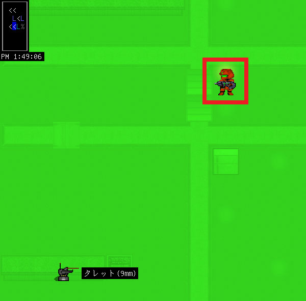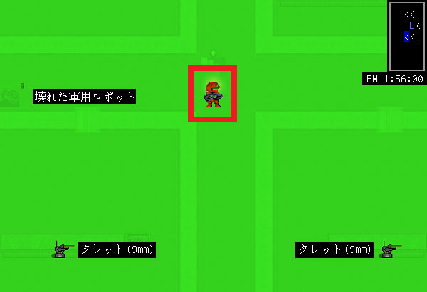 この時の戦場は上の画像。下の青い四角の場所に9mmタレットがいます。左の緑の四角の位置にいるのが軍用ロボットだ。初めて遭遇するロボットだが強そうな名前をしていやがる。