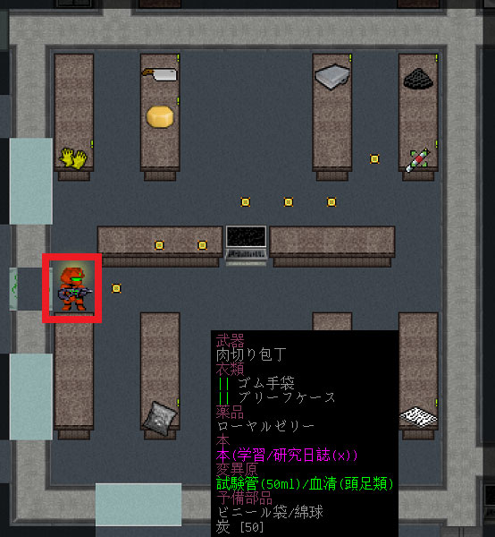 それでは地下2階西側の探索を再開します。適当に歩いていたら多くのアイテムが置かれている部屋を発見しました。 『血清/(頭足類)』をゲットできたのは嬉しいかもしれない。だが、頭足類ってタコとかイカのことなんだよなあ。俺はタコの血清なんて摂取したくないね。
