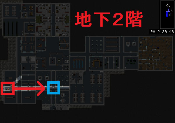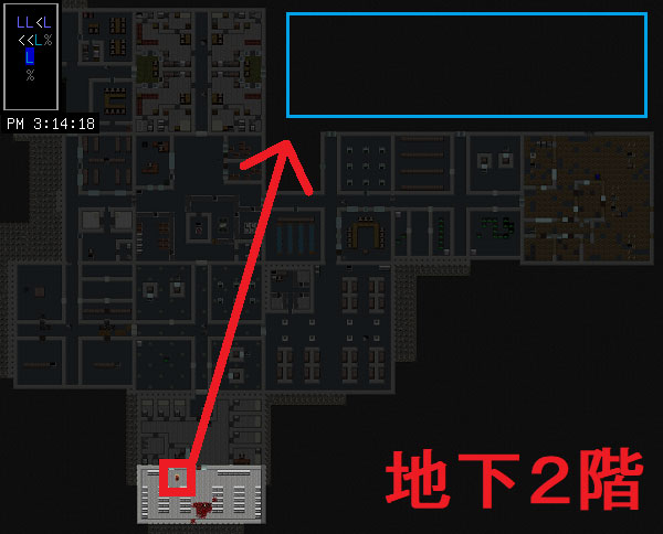 zombie super juggernautを撃破して地下2階の南側が完了しました。これで東西南北の全てのフロアを調べたかと思いきや、そんなことはなかった。プレイ画面を確認したところ、北側に未探索の区域があるのに気づく(青い四角の場所)。面倒くさいけど北のフロアを調べに行きます。