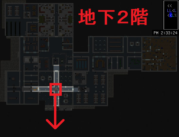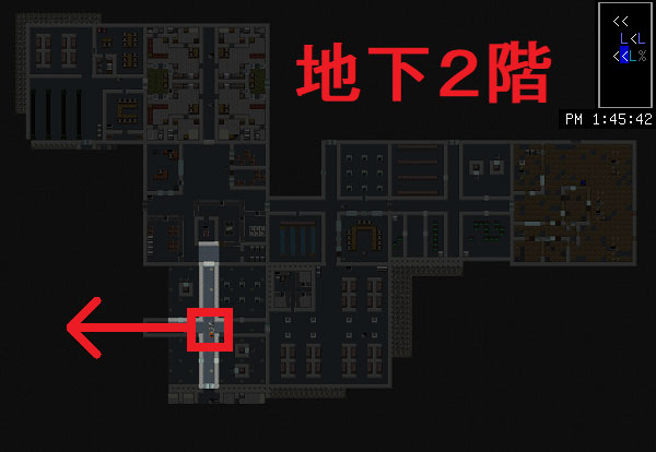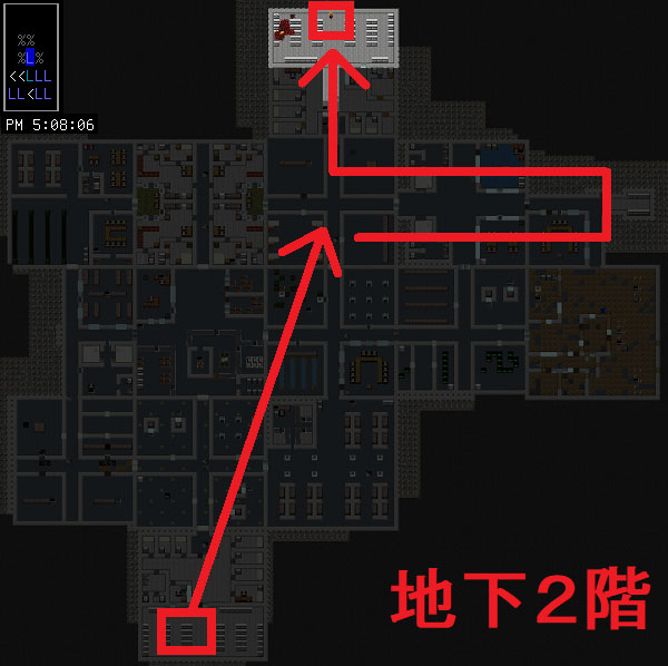 以上で地下2階にある全てのフロアを制圧しました。南の武器庫からフラフラと北へ移動して、適当に部屋を調べていたら2時間も掛かってしまった。ショッピングカートの場所に戻ってアイテムの整理をします。