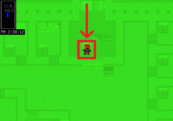 タレットは隣の部屋から壁を2~3個破壊して狙撃するしかあるまい。というわけで別の部屋に移動しようとしたら変な敵が出現しました。現在地の左側に『軍用ロボット』がいるようです。