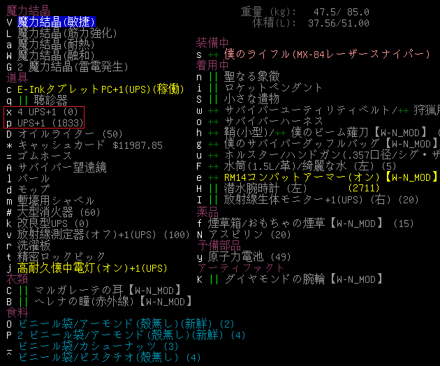 今回の投稿は地下2階の制圧が完了したところで終わりにします。現在の所持品と装備品は上の画像。UPS電力が枯渇する寸前だ。次回の投稿の開始時に満タンのUPSと交換しましょう。