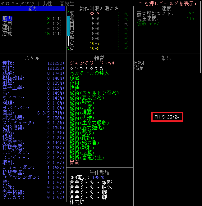 現在の能力値は上の画像。CBM電力の最大値が地味に100ほど増えています。次回の投稿は地下3階に進出するぞ。現在の時刻は夕方だし、今日中に地下3階の制圧を達成したい。