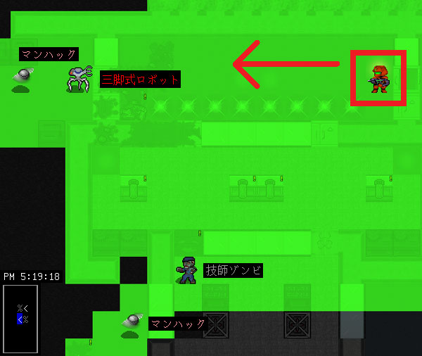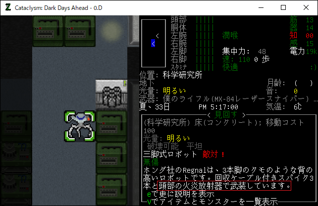 以上の準備を済ませて地下5階に降り立ちました。適当に透視をオンオフ切り替えながら進みましょう。どうやら右上にいる敵の名称は『三脚式ロボット』らしい。モンスターかと思っていたのだがロボットだったのか。油断をしちゃったあ。軍隊用の銃器を搭載していたら殺されてしまう。