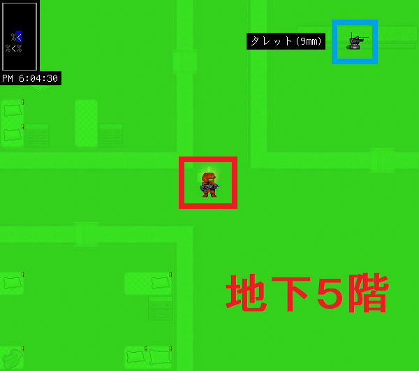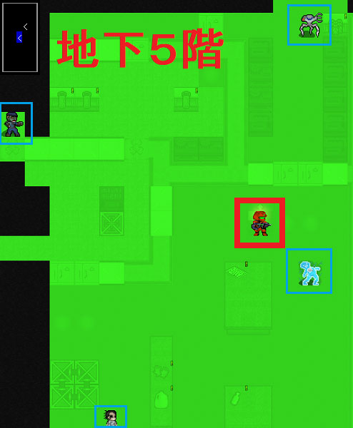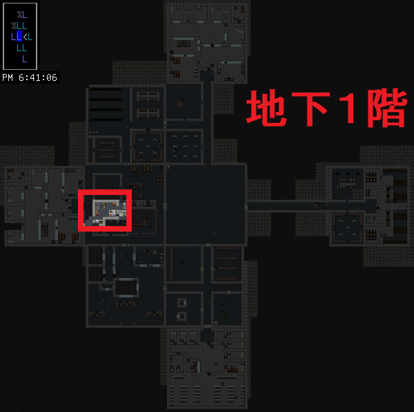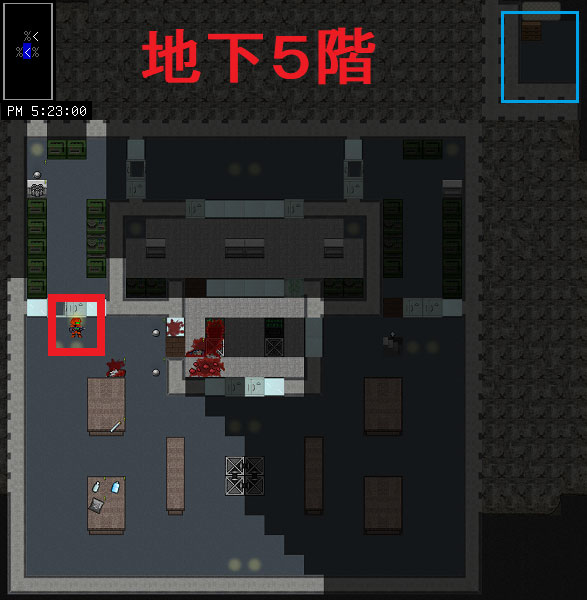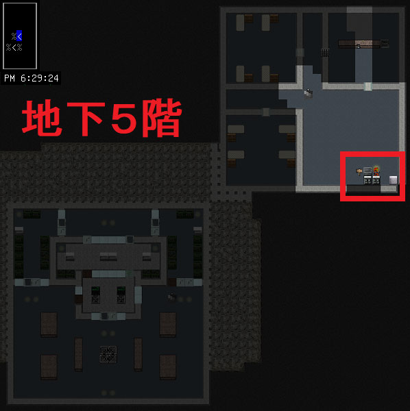 地下5階の右上のフロアを制圧しました。戦利品は1つもありません。これで科学研究所の探索は終わりなのかあ。いや、画像の右下にロッカーがあります。この科学研究所のロッカーはゴミばかりだったから期待はできない。無視するのはモヤモヤするのでロッカーを確認してみましょう。