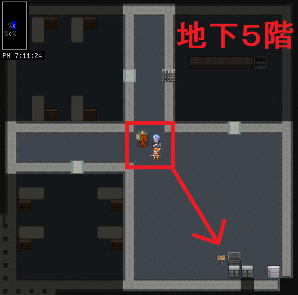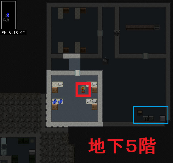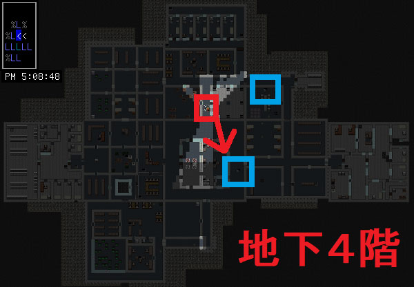 地下4階の様子は上の画像。地下5階に降りる階段は青い四角の場所にあります。2カ所あるわけだが、どっちで降りようかね。どうでも良いので右下の階段から降りることにしました。