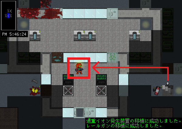 敵は全滅したしアイテムの回収も終わった。もう地下5階に用事は無いのだが、このフロアの中央には珍しい機械があるので遊びます。タロウ・タナカの周囲にある機械は科学研究所の名物であろう『ナノ製造装置』だ。
