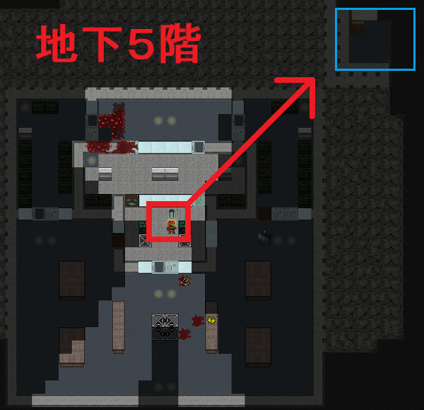 以上でナノ製造装置の説明は終わり。地下5階はこの科学研究所の最深部です。もうやることは無いと思いきや、画面の右上に未探索のフロアがあるみたい(青い四角の場所)。地下4階にあった別の下り階段で降りないと行けないようだぞ。