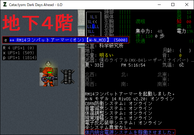 上がって来た放電ゾンビは軽く撃破しておきました。というわけで地下5階の攻略を始めます。コンバットアーマーの電池が無くなりそうだったので補充しておいたよ。あとはCBM電力でレーザーの発射ができるように体内統合電源システムをオンにした。