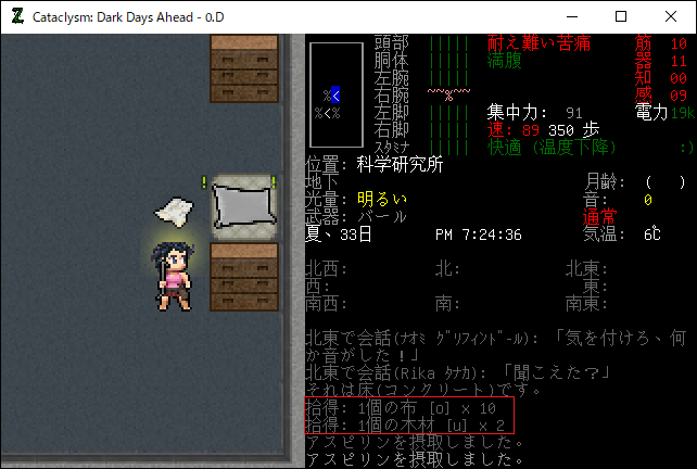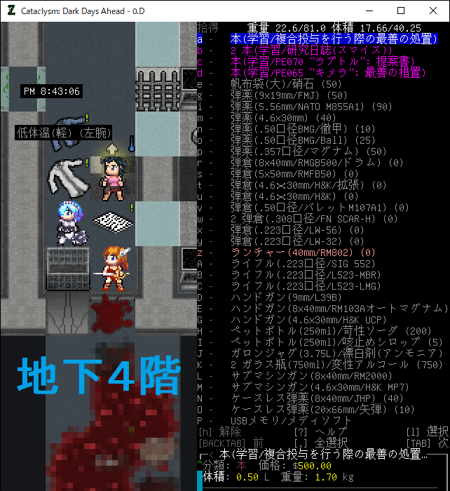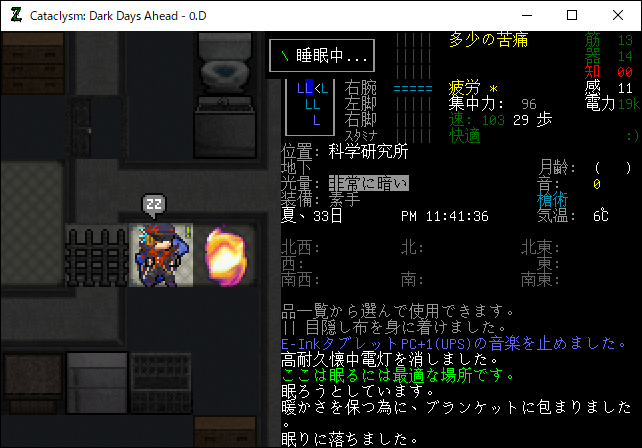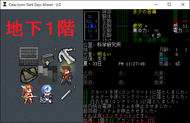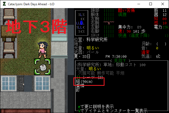 Cataclysmのプレイ日記を始めます。科学研究所の地下5階に到達しました。前回は盗賊に襲撃されて骨折しちゃったよ。武器と防具も奪われたし、これからどうすれば良いわけ?