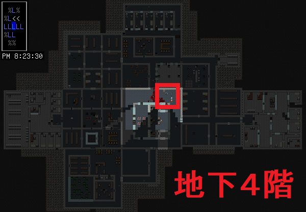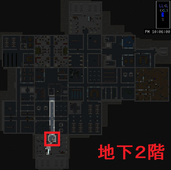 地下1階の戦利品から持ち帰る物を選びました。内容は頭足種の血清、打撃スキルの初心者本、少々の銃器、あとは塩素や硝酸などです。地下1階の戦利品が一番ショボかったなあ。この階層は牢獄ばかり生成されたしね。各階で厳選したアイテムは現在地の周囲に置いたのだ。この場所に集めたアイテムを救急車に積み込むのは明日にしよう。