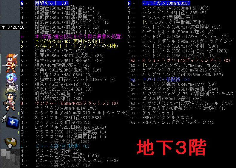 地下3階から持ち帰るアイテムは上の画像。沢山並んでいるけど放置したアイテムの方が多い。選んだアイテムの内容は6種類の血清、学習本、武術本、大量の銃器、食料です。たぶん地下3階の戦利品が最も充実していたと思う。