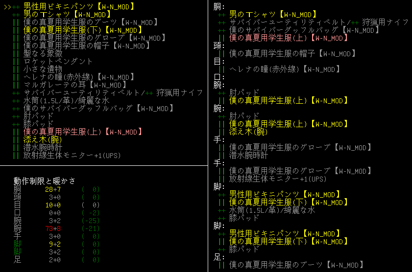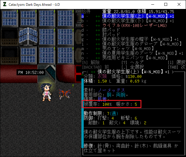 残念ながらRM14コンバットアーマーは奪われてしまった。というわけでコンバットアーマーの前に装備していた耐火学生服をかき集めたよ(上の画像)。耐火学生服は性能が優秀なうえに暖かさが5と低い。しかし、そろそろ真夏になるので暖かさは不要になる。久しぶりにjsonをいじくって暖かさがゼロの防具に改造しておきましょう。