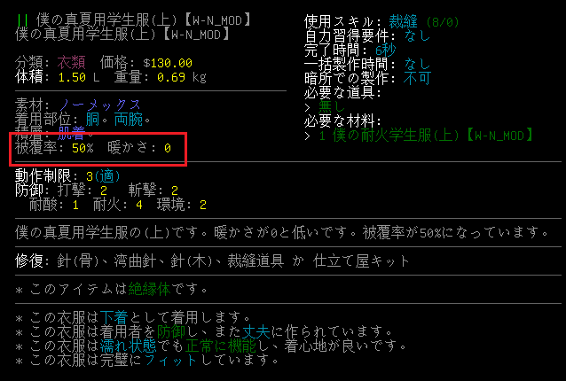 真夏用の学生服のレシピを用意しました(上の画像は一例)。材料は耐火学生服になる。性能は耐火学生服とほぼ同じです。変更した箇所は暖かさと被覆率だ。暖かさを5から0、被覆率は100%から50%に減らしておいた。