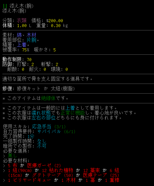 まだまだやるべきことは沢山あります。次は『添え木(腕)』の材料を集めましょう。骨折は添え木を身に付けないと治療できないのだ。必要な材料は布、木材、紐(90cm)です。