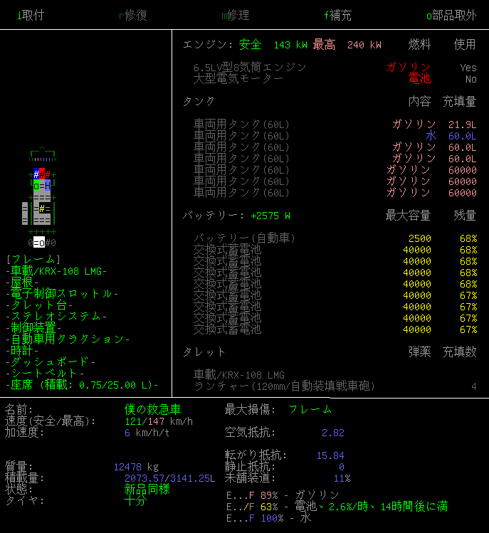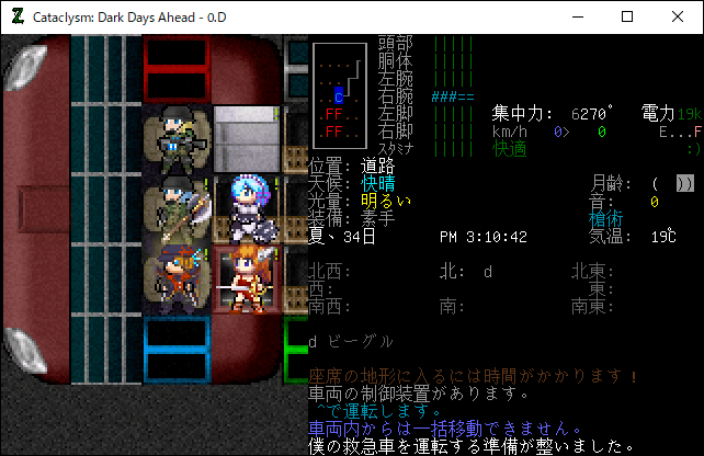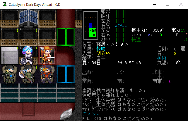 Cataclysmのプレイ日記を始めます。今回の投稿は科学研究所の戦利品を高層マンションに持ち帰ります。全ての戦利品を車両に積み込めるのかは不明なので2~3往復するかもしれません。