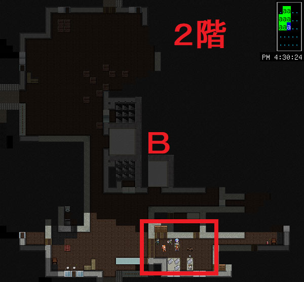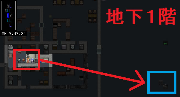 お腹が一杯になったので戦利品の運搬を開始しましょう。科学研究所の戦利品は現在地の右側にある階段の周囲に集めておきました。ちょうど青い四角で囲んだ場所ですね。