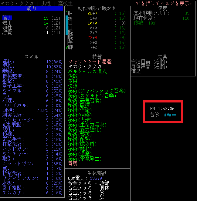 現在の能力値は上の画像。右腕の骨折は一晩就寝すれば完治するだろう。次回は血清で身体を強化して州兵基地へ攻め込む準備をします。